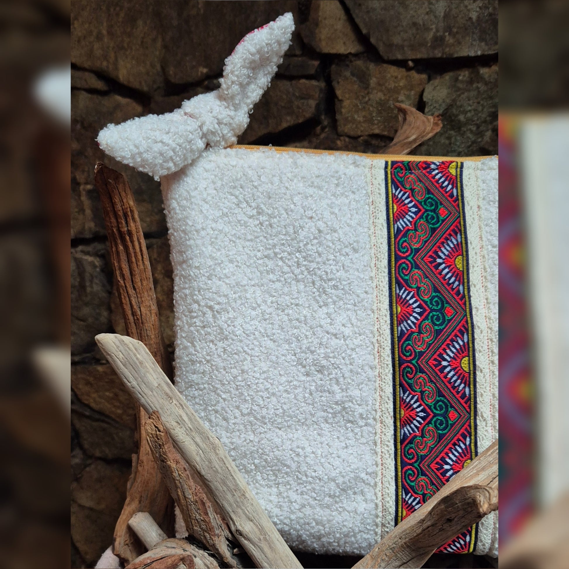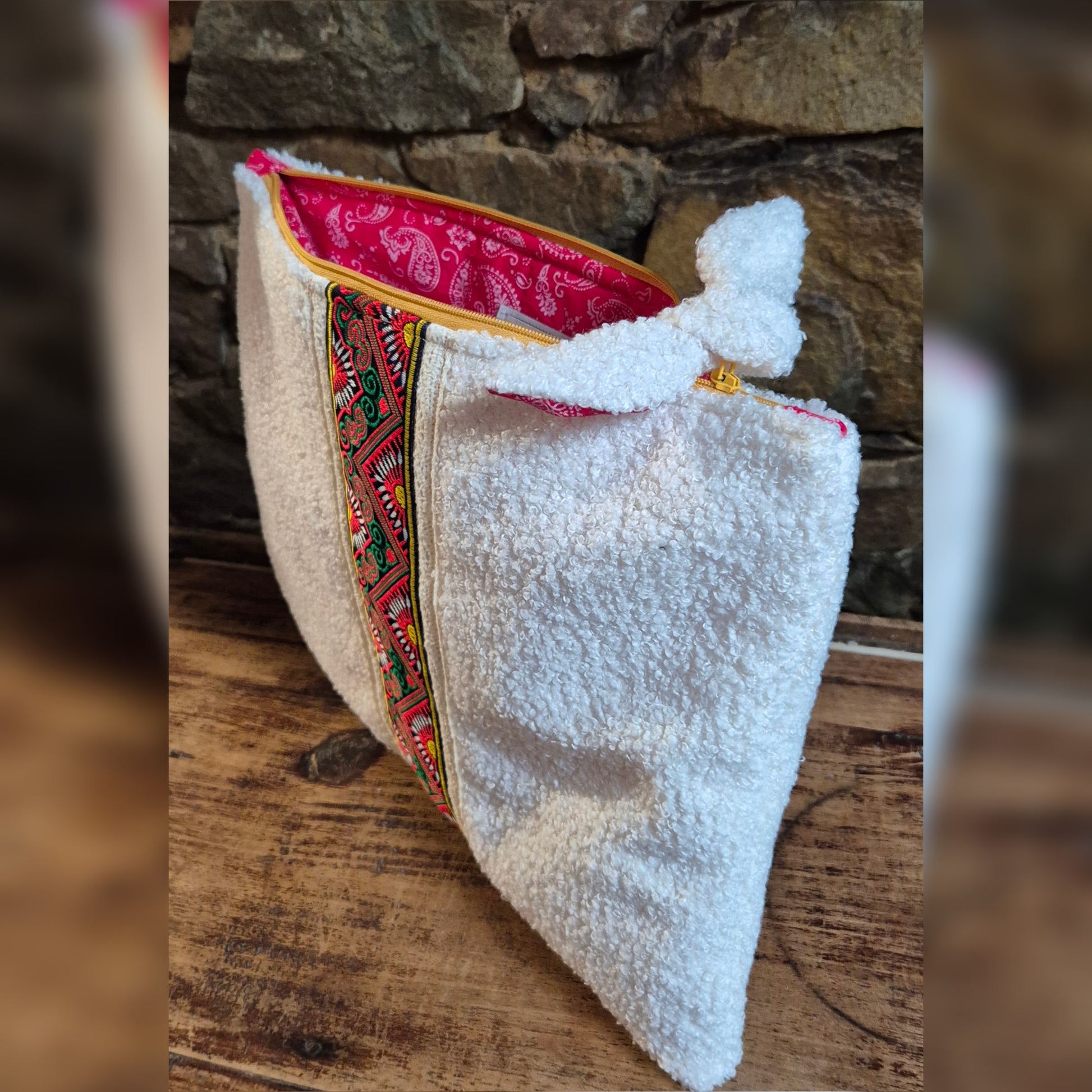Grande Pochette en tissu teddy, blanc cassé. Doublure en coton rouge, imprimé cachemire. Fermeture éclair orange clair avec son joli nœud en tissu.