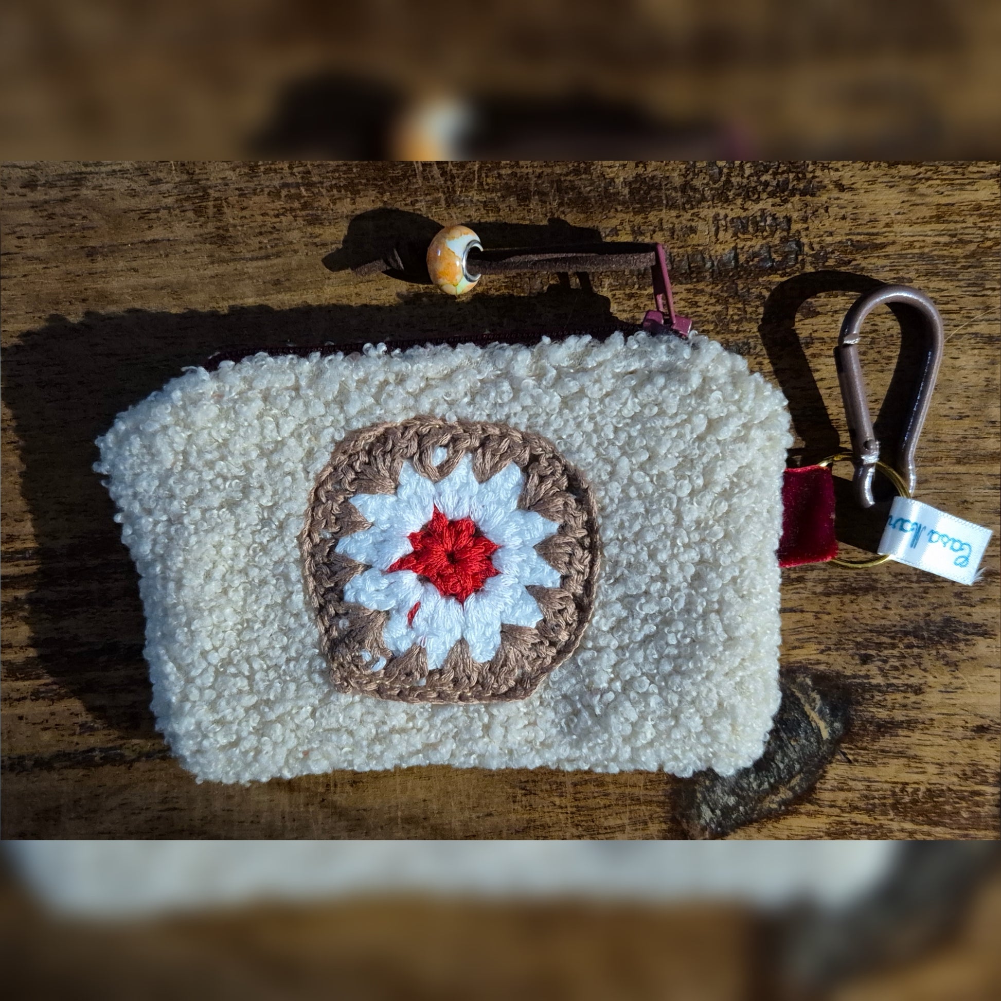 Petit porte pièces (12cm/9cm) en tissu teddy beige et son sticker en crochet. Fermeture éclair bordeaux.