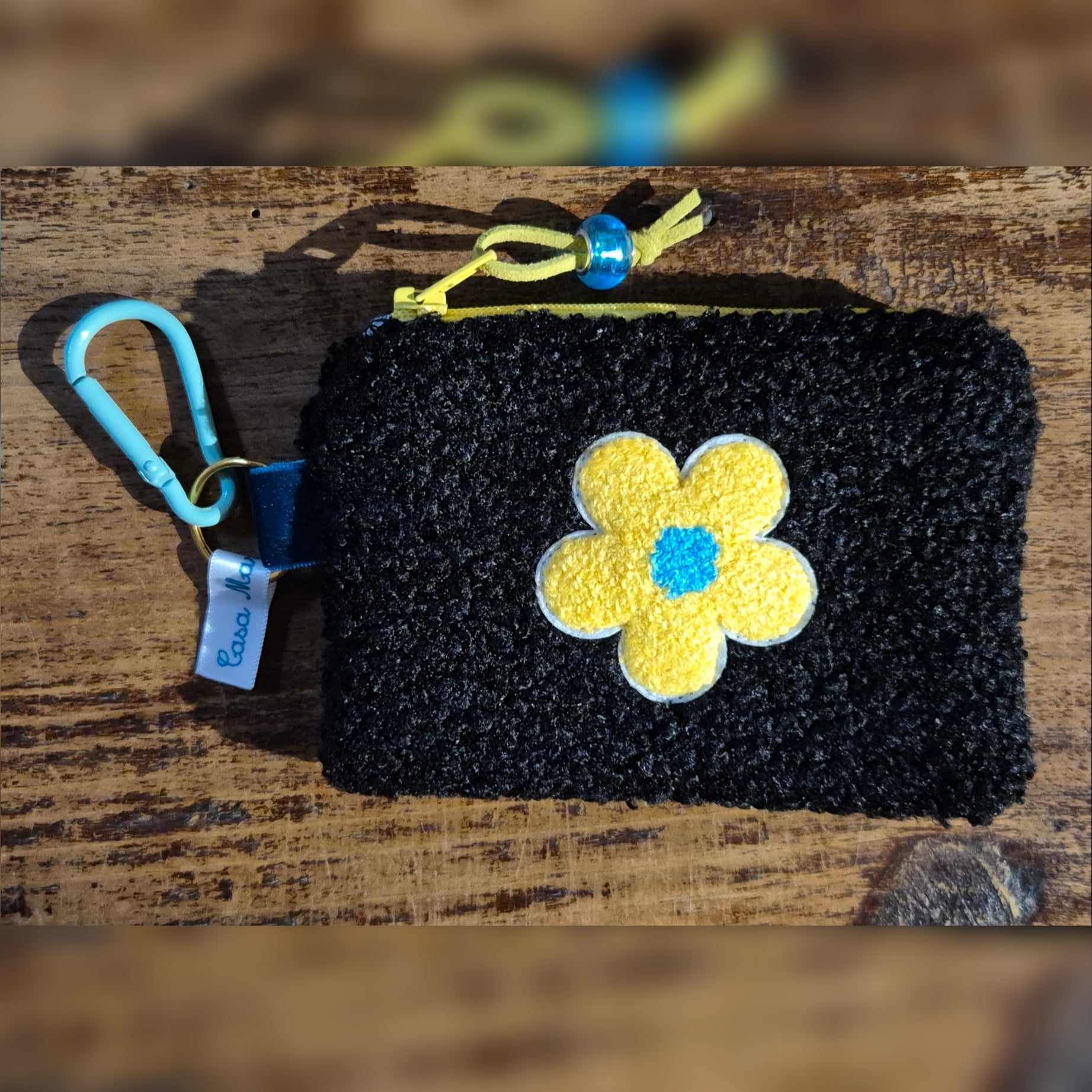 Petit porte pièces (12cm/9cm) en tissu teddy noir avec sa petite fleure jaune. Fermeture éclaire jaune.